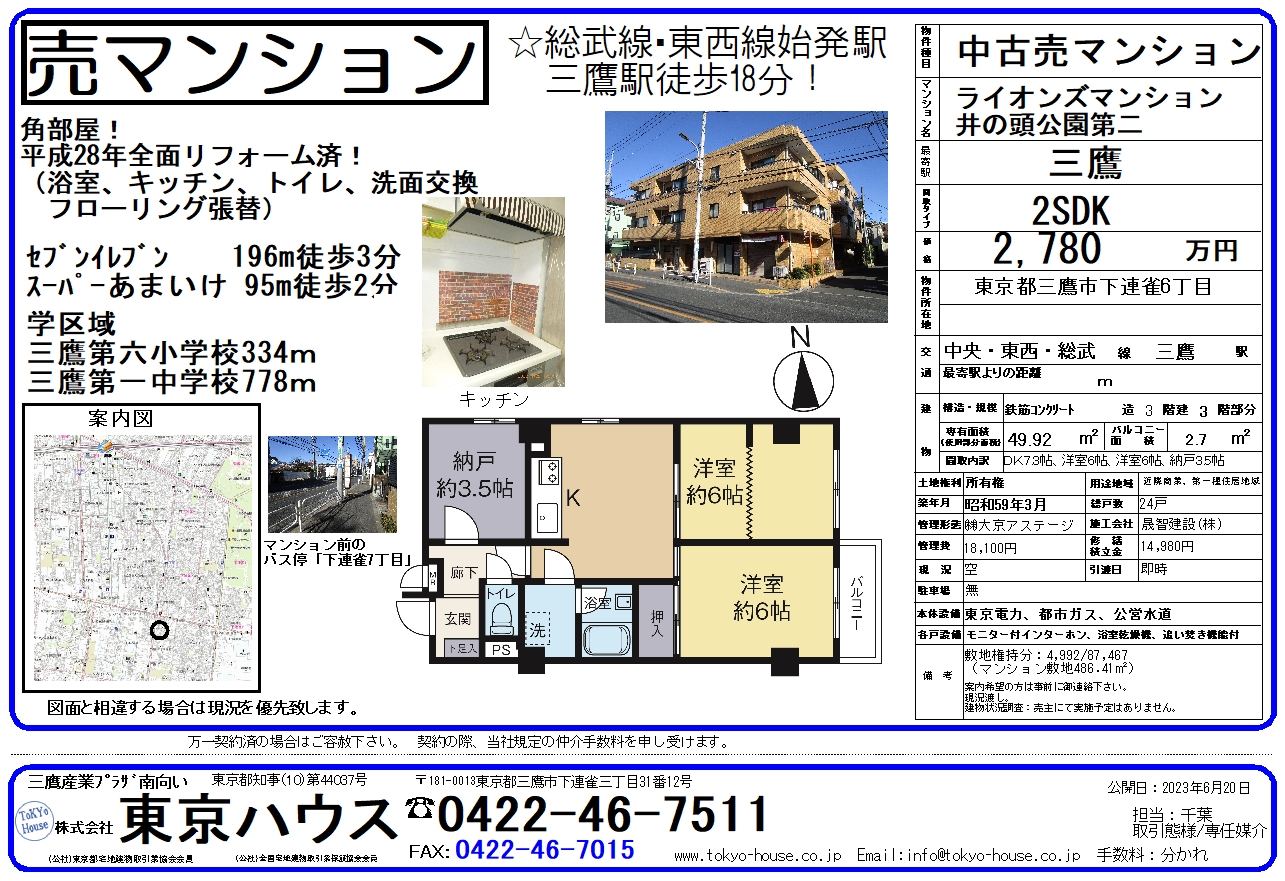 売買物件 三鷹市上連雀5丁目戸建 土地102.51㎡ 価格 6,880万円 最寄駅 中央線三鷹駅徒歩12分 2SLDK 所沢市山口(売地) 1,080万円 35.05坪 西武山口線 遊園地西駅 徒歩7分 詳細は写真をクリックして下さい。